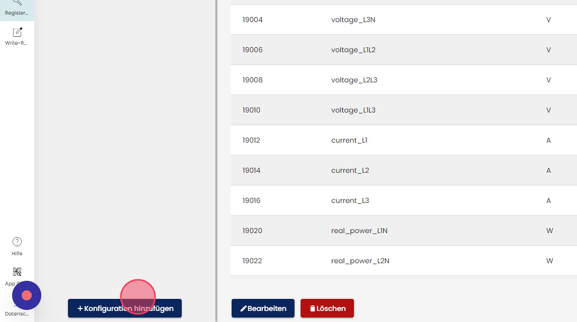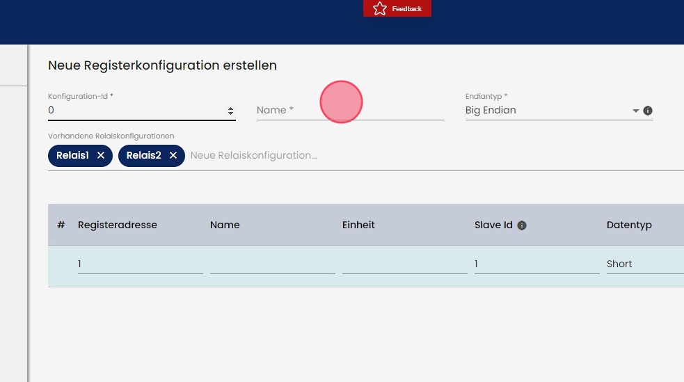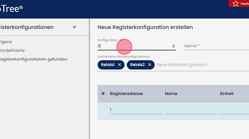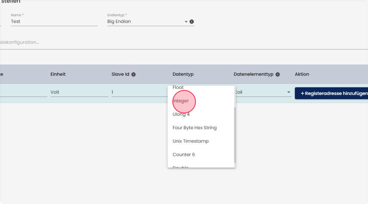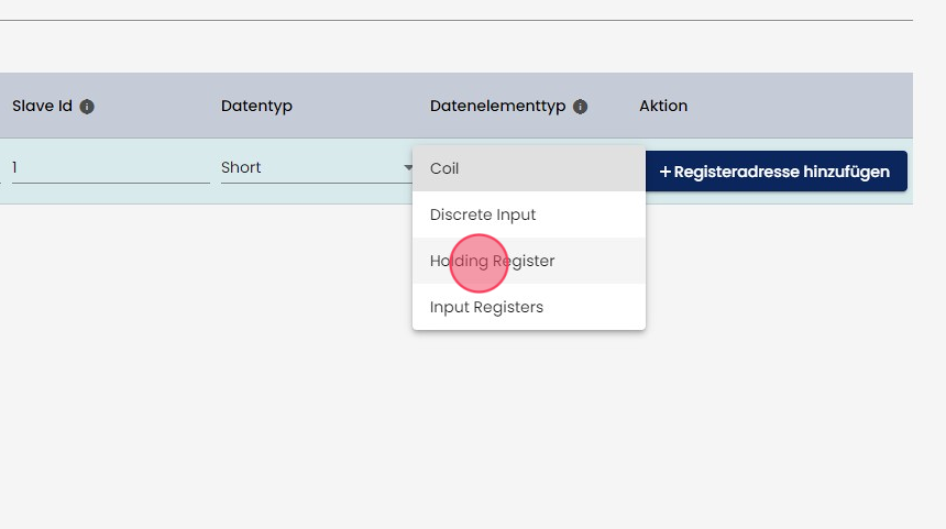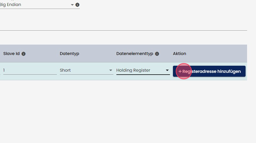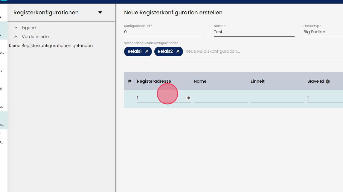 Nun können Sie alle auszulesenden Register des angeschlossenen Modbus Geräts nacheinander definieren. Geben Sie hierzu zuerst die Registeradresse an.