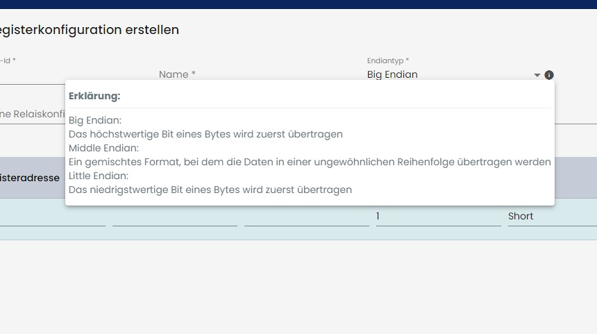Wählen Sie den "Endiantyp" der Konfiguration aus. Informationen über den Endiantyp finden Sie zumeist in der Registerbeschreibung des über Modbus anzuschließenden Geräts.