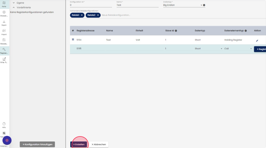 Haben Sie nun alle gewünschten Registeradressen definiert, können Sie die Konfiguration mit Klick auf "Erstellen" anlegen.