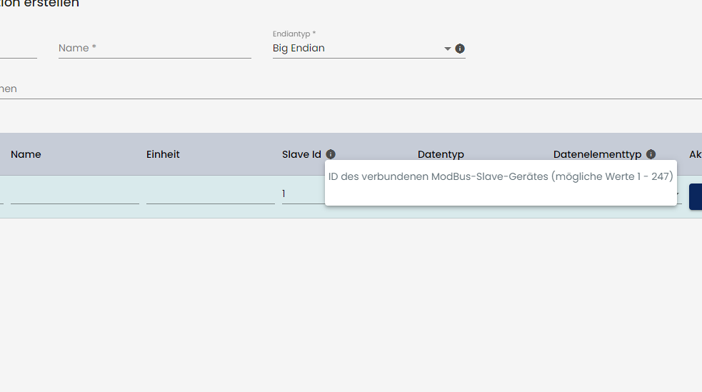 Die für die Erstellung der Registerkonfiguration notwendigen Parameter (Registeradresse, Slave Id, Datentyp, Datenelementtyp) können Sie aus den Informationen des anzuschließenden Geräts entnehmen.
