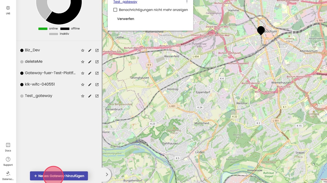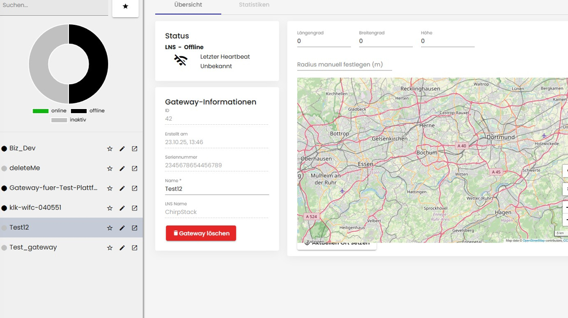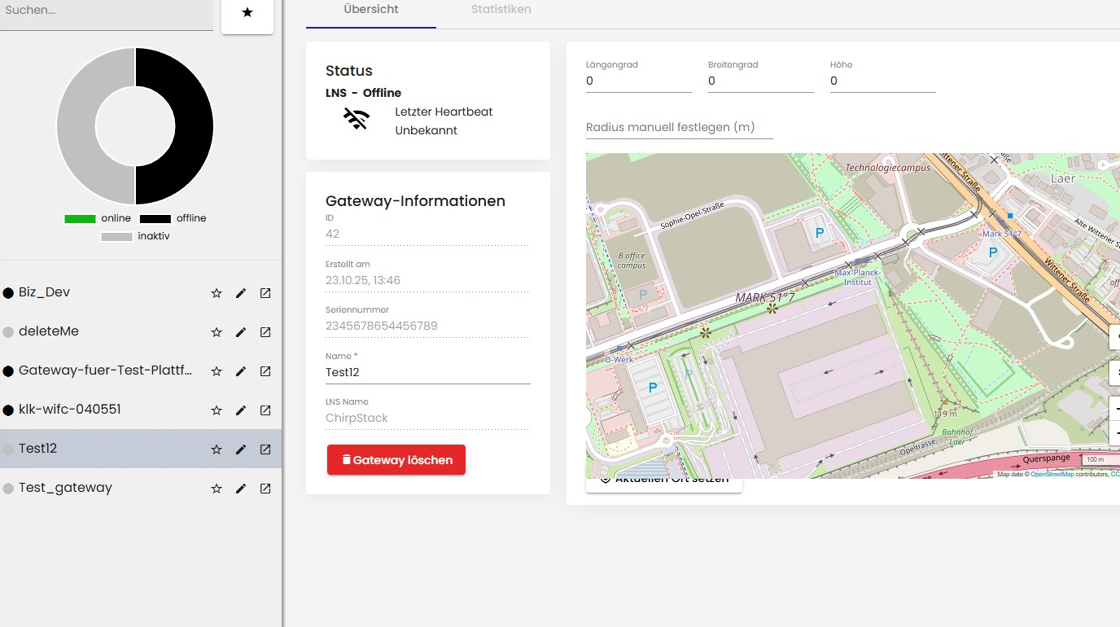 10. Die Koordinaten des Gateways werden nach Inbetriebnahme in Ihrem LoRaWAN-Netzwerk automatisch abgeleitet und der Standort-Marker an die entsprechende Position in das Open-Map Tool von IoTree gesetzt.