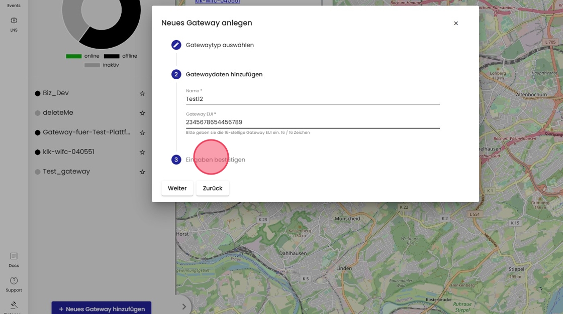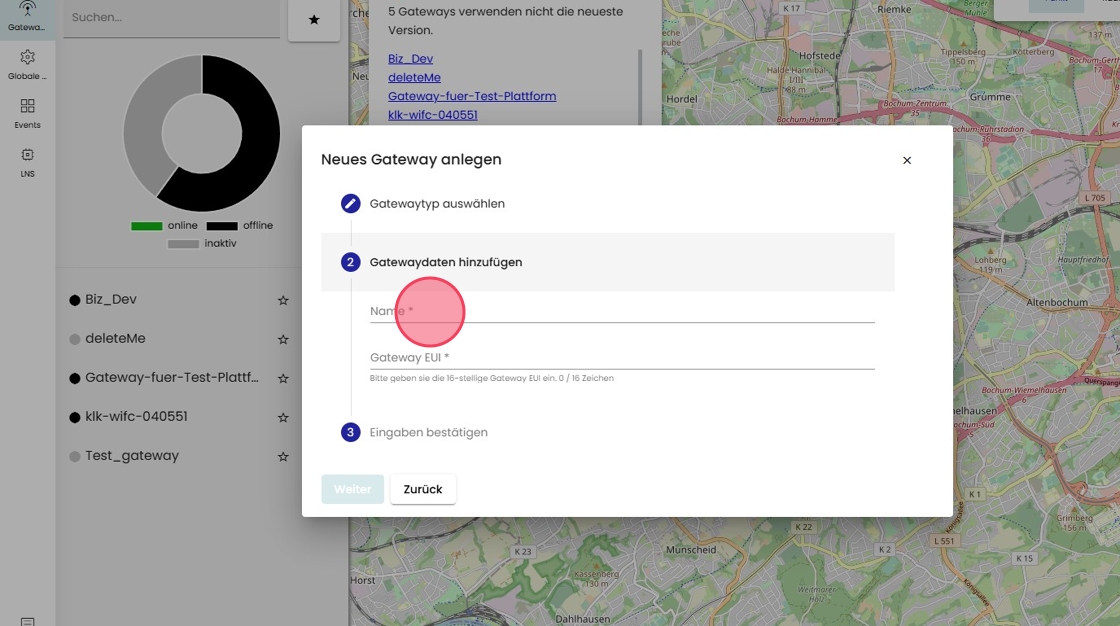 5. Dabei muss dem Gateway ein Name vergeben und die EUI eingetragen werden. Angaben wie Konnektivitätseinstellungen werden im Gegensatz zu den Kerlink-Gateways nicht benötigt.